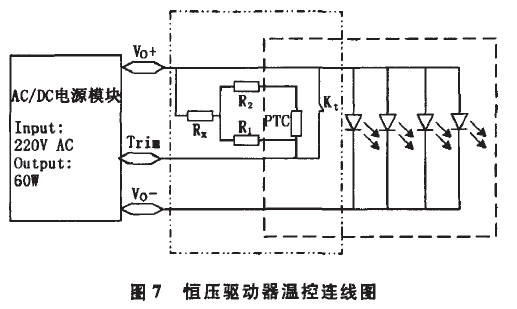圖7為恒壓驅(qū)動器溫控的連線圖。Trim端用來調(diào)節(jié)電源的輸出。左側(cè)點線型虛線框中部分為控制電路,其中:PTC為正溫度系數(shù)溫敏電阻;R1、R2、R,均為普通電阻,與PTC溫敏電阻匹配調(diào)節(jié)驅(qū)動器輸出電壓;Kt為常閉型溫度繼電器,其斷開溫度為60℃,自動閉合溫度為48%。右側(cè)虛線框中部分為LED模塊部分。Kt和PTC安裝在LED模塊上,并與模塊緊密接觸。常溫下Kt處于閉合狀態(tài),此時控制電路中控制驅(qū)動器額定輸出,該LED模組常溫工作額定總電壓為24V。當(dāng)繼電器溫度上升到60℃時Kt