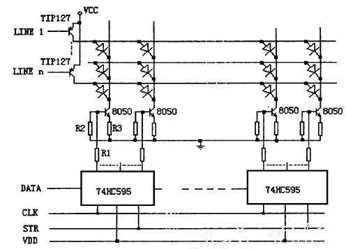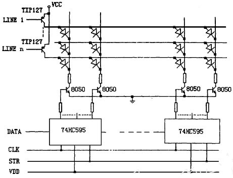常規(guī)型驅(qū)動(dòng)電路的設(shè)計(jì)一般是用串入并出的通用集成電路芯片如74HC595或MC14094 等作為列數(shù)據(jù)鎖存,以8050 等小功率NPN 三極管為列驅(qū)動(dòng),而以達(dá)林頓三極管TIP127等作為行掃描管,其電路如圖1 所示。