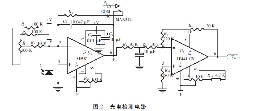 亮度測量電路由I/V轉換電路和二級放大電路組成。OLED器件發出的光入射到光敏二極管GT101,輸出僅0.002~200μA 的電流信號,I/V轉換電路器件選用具有極低輸入偏置電流的單片電路靜電計型運算放大器OP07.OP07具有低輸入電流和低輸入補償電壓,因此適合作為非常敏感的光敏二極管的前置放大器。如圖2所示,通過調節R12可將運放的失調調零,R2補償集成運放的偏置電流。
