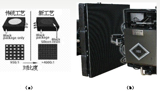 如圖1所示,(a)左側為傳統工藝的LED發光管。一般為黑色面碗LED發光管,管芯為白色。(a)右側為Barco公司采用新技術,使用黑色管芯,有效提高了對比度指標。(b)圖為采用新工藝的P4間距SMD顯示屏模組。