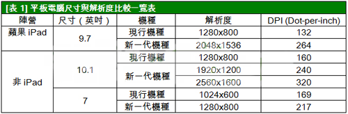 以現(xiàn)行市場(chǎng)販?zhǔn)鄣钠桨咫娔X為例,無(wú)論攻占七成市占的9.7寸蘋(píng)果iPad,或者是其他品牌7寸與10.1寸的產(chǎn)品,解析度幾乎都落在130至170 DPI間。由于iPad可能仿效先前iPhone 3GS進(jìn)化到iPhone 4G解析度升級(jí)的過(guò)程,一口氣將下一代iPad 3的解析度提升至264 DPI,此舉勢(shì)必引發(fā)其他競(jìng)爭(zhēng)者在面板解析度規(guī)格上的追逐。