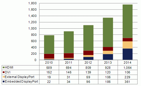 另外在PC/Display Interface By Device, Q4’11 Forecast (電腦與顯示器接口統計數據庫與預測) 報告中,In-Stat 針對所有搭載各種接口(Embedded DisplayPort, External DisplayPort, DVI, HDMI)的數字電子裝置進行統計與預測。2011年在所有搭載數字界面的電子裝置中,搭載HDMI的數量達到了9億零6百萬單位,預計2014年將成長到17億單位以上。這其中包含了智能手機、移動電腦、投影機、電腦顯示器、周邊裝置、數碼相機、攝像機、MP3、游戲機、機頂盒、藍光播放器、數字電視、商用顯示器等手持式消費性電子產品和固定式消費性電子產品。