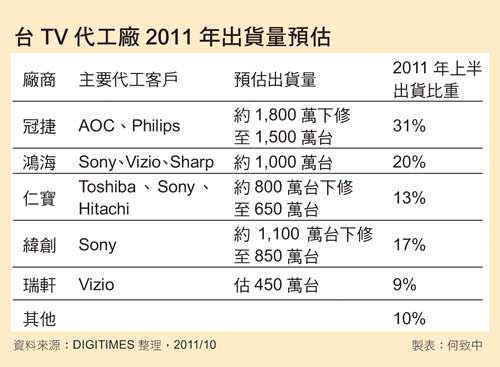 液晶電視制造龍頭冠捷雖握有自有品牌AOC與飛利浦(Philips)品牌訂單,但亦因整體市場(chǎng)需求不佳,下調(diào)2011年出貨量,從原先1,800萬(wàn)臺(tái)下修至約1,500萬(wàn)臺(tái);緯創(chuàng)第3季表現(xiàn)雖相對(duì)較佳,出貨量仍逐月成長(zhǎng),一路從55萬(wàn)臺(tái)爬升至80萬(wàn)臺(tái),然近期亦將全年液晶電視出貨量從1,100萬(wàn)臺(tái)下修至約850萬(wàn)臺(tái);至于手握Sony液晶電視訂單的鴻海,2011年也面臨出貨量下修窘境。