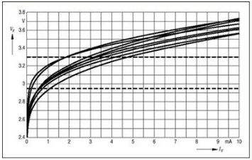 即使是同一型號的LED其伏安特性在各個個別的器件之間也是不同的,更何況在不同生產(chǎn)廠家之間就更是不同了(圖8)。