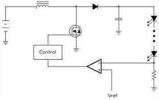 圖中顯示了一個基本的電感升壓電路,其中控制器(Control)給出了一個PWM開關(guān)信號來控制大功率開關(guān)管,后者在導通時對電感充電,而在斷開時電感中的能量就對電容充電。經(jīng)過幾次開關(guān)以后就可以把輸入電壓泵至更高的電壓,從而完成升壓的任務。改變PWM信號的工作比就可以改變其輸出電壓。為了保持輸出電流的恒定,就要求測量輸出電流值,這是靠一個和LED串聯(lián)的小電阻來測量的。這個電阻上的電壓就和一個參考電壓相比較,比較所得出的誤差信號就送去控制器用以改變PWM信號的工作比,這樣就實現(xiàn)了一個閉環(huán)自動控制,以控制其輸出電流為恒定。