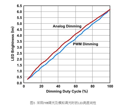 此外,驅(qū)動器可達(dá)到較高的光電轉(zhuǎn)換效率,這表示耗用相同的電力可達(dá)到更高的流明。然而,模擬調(diào)光也有深度調(diào)光的某些電流準(zhǔn)確度問題,此因回饋調(diào)節(jié)電壓或電流汲入電壓過小,而無法準(zhǔn)確控制,此乃受限于錯誤放大器的偏移電壓所致。亮度線性及色度也不比PWM調(diào)光,尤其是在深度調(diào)光時(圖5)。事實(shí)上,除非將兩個相同的顯示器并置進(jìn)行比較,否則一般人很難辨別色度或線性的差異。