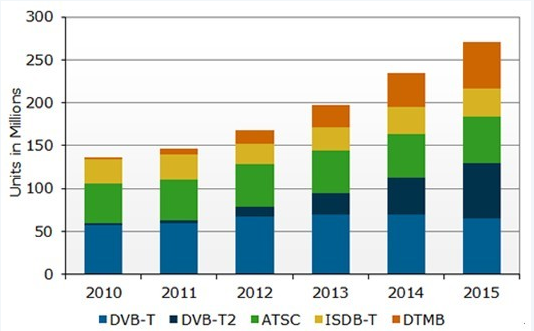 報告指出許多關鍵國家都已經引進或者承諾引進DVB-T2。預計到2015年,DVB-T2地面數字電視出貨量將從2011年的340萬臺上升到6千4百70萬臺。