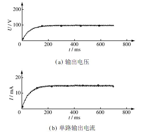 為理論上驗證設計的可行性,采用PSp ice軟件對電路進行了仿真分析。結果如圖2所示。電路在210 ms時進入穩定狀態,穩定后其輸出電壓為97 ±2. 2 V,輸出電流為14. 7 ±0. 3 mA,基本驗證了電路設計的可行性。LED 日光燈電路輸出特性如圖2所示。