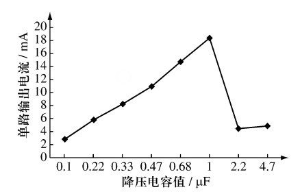 在不損壞LED的條件下進行了測試,降壓電容C1 的電容值與輸出電流的關系如圖4所示(因為兩個電容是相同的,圖4中只表示出單一電容值)。可見,隨著電容值的增加,輸出電流幾乎呈線性上升,待增加到一定值時(約20 mA) ,保護電路起作用,迫使經過LED支路的電流下降。