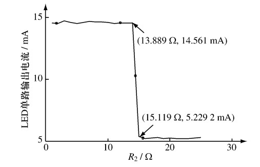 為驗證輸出保護電路的功能,對電阻R2 進行參數掃描分析,之后進行性能分析。結果如圖3所示。可以看出,當R2 從1 Ω 增大到13. 889Ω時,輸出電流開始下降,表明此時單向晶閘管處于臨界導通狀態;然后隨著R2 的繼續增大,輸出電流急劇下降,直至R2 為15. 119Ω時,輸出電流穩定在5. 2 mA 左右,表明單向晶閘管已經完全導通,保護電路已經起作用。