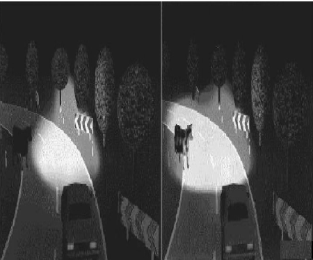 圖9 傳統前照燈( 左) 與AFS 前照燈( 右) 彎道盲點照明效果