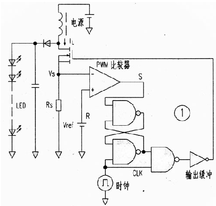 圖1是這種驅動電路的方框圖,它省略了傳統(tǒng)電路的三角波發(fā)生器和誤差放大器,而使用了CM0S邏輯IC和PWM調制器。當時鐘CLK信號為低電平時,RS觸發(fā)器處于復位狀態(tài),輸出FET關斷。而當CLK信號為高電平時,輸出FET導通。其電流被電阻Rs轉換成電壓,當此電壓高于基準電壓Vref時,比較器輸出由高變低,RS觸發(fā)器又被復位,輸出FET再關斷。其結果,即使電源電壓有變化,儲存在電感中的能量卻是恒定的。實現了恒功率輸出。這里是把Rs上的電壓降作為三角波電壓,PWM比較器將此電壓與基準電壓直接比較而起到了誤差放大器的作用。