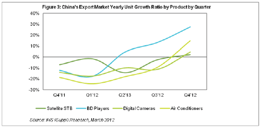 據IHS iSuppli公司的中國研究報告,全球經濟增長速度低于預期將在2012年上半年損及中國消費電子出口市場,衛星機頂盒(STB)、藍光光盤(BD)播放器、數碼相機和空調銷售將全面下滑。