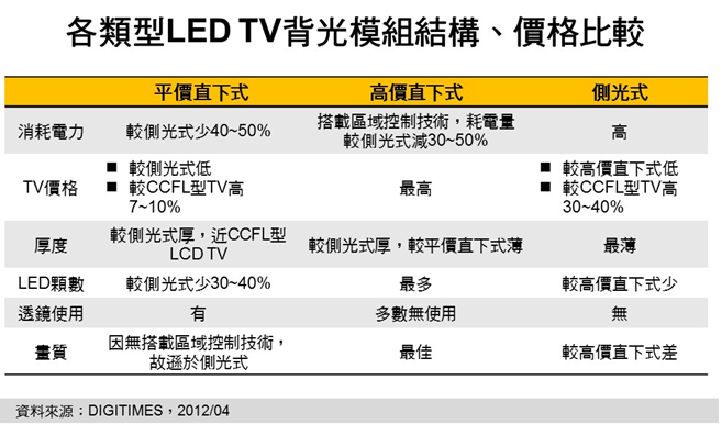 近期南韓TV業(yè)者如三星電子(Samsung Electronics)及樂金電子(LG Electronics)為吸引消費者需求,開發(fā)出消耗電力較低、價格亦較低的直下式LED TV機(jī)種,價差與CCFL 型LCD TV拉近至10%以內(nèi)。