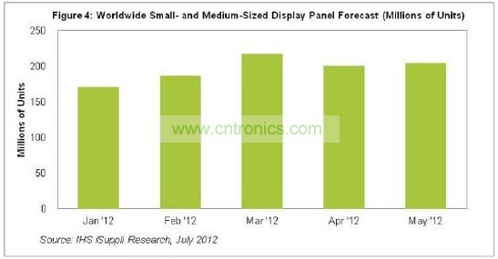 5月份臺灣與韓國面板廠商的中小顯示器面板出貨量升至2.047億塊,扭轉了下滑局面。4月出貨量減少8%,至2.005億塊,如圖所示。這類面板主要用于手機、平板電腦和數碼相機。3月份出貨量達到2.175億塊,但4月份需求下降。5月出貨量增長顯示市場狀況好轉,盡管幅度很小。
