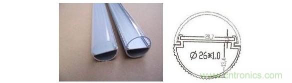 內置電源的另一個最大缺點是壽命低。因為電源必須放在鋁管里,所以鋁管不可能做成鰭片的形式,而只能是普通的半圓柱型,頂多在表面上加上一些很淺的條形溝槽(圖4)。