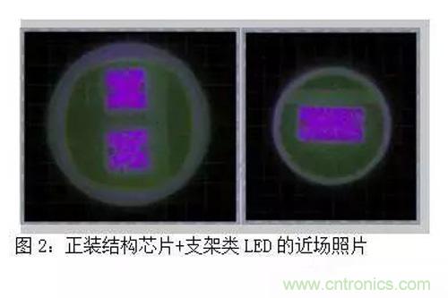 這類芯片廣泛被中低功率的封裝產品所采用,優點是價格低;缺點是由于藍寶石導熱性能差,所以芯片散熱較差,P型材料的導電性也較差,因此注入電流受到限制。此外,芯片是五面發光的,通常需要將將芯片置于支架內,如圖2所示,反光杯的開口面積遠大于芯片發光面積,導致單位面積光通量低,芯片表面顏色均勻性非常差,芯片正上方偏藍,而外圈偏黃。這就是在使用中,如射燈、平板燈等,出現黃圈的原因。