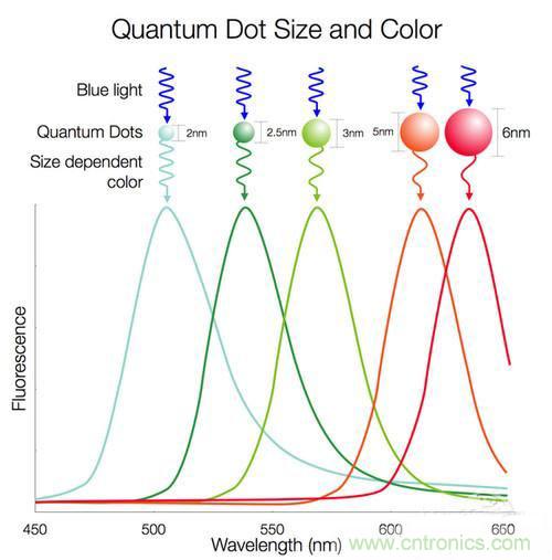 不同大小尺寸的量子點(diǎn)會(huì)發(fā)出不同的顏色,量子點(diǎn)當(dāng)受到光或電的刺激時(shí),就發(fā)出有色光線,光線的顏色由量子點(diǎn)的組成材料和大小形狀決定,一般顆粒越小,會(huì)吸收長波,顆粒越大,會(huì)吸收短波。