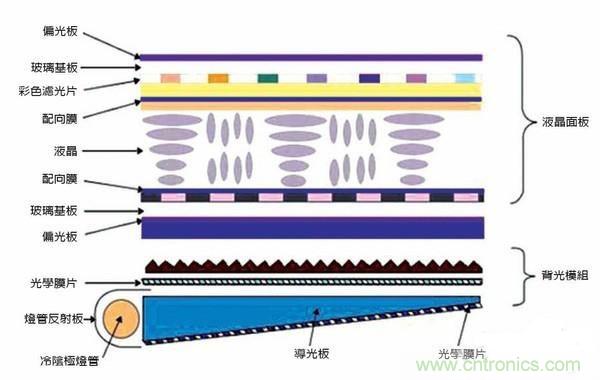 我們先來看看歷史已久的LCD顯示技術(shù),LCD顯示屏結(jié)構(gòu)非常復(fù)雜,LCD 的構(gòu)造是在兩片平行的玻璃基板當(dāng)中放置液晶盒,下基板玻璃上設(shè)置TFT(薄膜晶體管),上基板玻璃上設(shè)置彩色濾光片,通過TFT上的信號與電壓改變來控制液晶分子的轉(zhuǎn)動(dòng)方向,從而達(dá)到控制每個(gè)像素點(diǎn)偏振光出射與否而達(dá)到顯示目的。