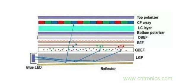 與此同時(shí),QDEF層連擺放位置很計(jì)較,為了讓光在層層光學(xué)膜中旅行時(shí),重復(fù)反射通過QDEF的次數(shù)增多,所以QDEF還得放在離光源最近的地方,一但順序往上移,紅綠光的轉(zhuǎn)換不足,就會(huì)造成偏藍(lán)的現(xiàn)象。