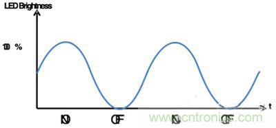 我們?cè)诒疚拈_(kāi)始處通過(guò)筆記本電腦的電源鍵為例簡(jiǎn)單介紹了一下呼吸效應(yīng)。持續(xù)地逐漸提升或逐漸下降兩級(jí)之間的占空比能讓LED形成“呼吸”的效果,如圖6所示。待機(jī)模式下電源按鍵支持呼吸效應(yīng)能告訴用戶(hù)電源按鍵是活動(dòng)狀態(tài)并能進(jìn)行操作。