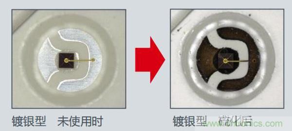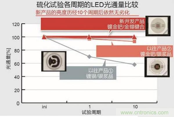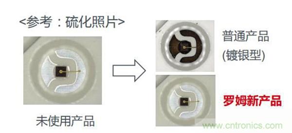 通過對(duì)比得出ROHM新產(chǎn)品的優(yōu)勢(shì):一是能保持亮度,二保護(hù)芯片鍵合材料不受損壞,三無需其他保護(hù)對(duì)策。