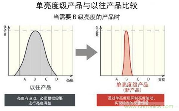 單亮度等級(jí): 羅姆將ABCD即紅藍(lán)黃白的亮度更細(xì)分化,可從一般市場(chǎng)中的赤橙黃綠青藍(lán)紫細(xì)到17種顏色。
