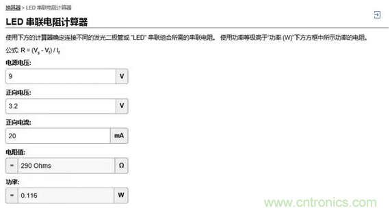 為了簡(jiǎn)化計(jì)算,Digi-Key提供了一個(gè)LED串聯(lián)電阻計(jì)算器,幫您計(jì)算電路設(shè)計(jì)中所需要電阻的阻值和功率。