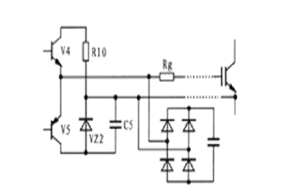 圖5所示為EXB841與IGBT柵-射極之間的連接電路原理圖。當驅動電路中的V4導通時,IGBT處于正常導通狀態(tài),當V5導通時,IGBT柵-射極之間通過穩(wěn)壓管VZ2提供一個-5V電壓加在其兩端,使IGBT關斷,此時V5處于臨界導通狀態(tài),穩(wěn)壓管VZ2處于反向偏置狀態(tài)。但由于集-柵極之間分布電容的影響,集-柵極之間的du/dt增大時,其通過分布電容形成的電流經(jīng)過,所以,要克服集-柵極之間的du/dt,確保穩(wěn)壓管不過壓,避免IGBT誤導通。克服du/dt的方法有二種:一是驅動電路輸出與IGBT柵-射極之間的連線采用雙絞屏蔽電纜,屏蔽層接地,二是采用快速吸收電路吸收過電壓。