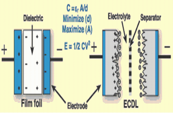 圖2 在結構上,超級電容器和電池或電解電容器的主要區別是電極材料