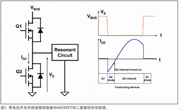 圖1所示為零電壓開關(guān)半橋諧振轉(zhuǎn)換器中MOSFET和體二極管的傳導(dǎo)原理。在這種轉(zhuǎn)換器中,電流波形滯后于電壓。假設(shè)Q1開通,Q2關(guān)斷。Q1傳導(dǎo)諧振電流。在一定時(shí)間之后,由控制環(huán)路決定,Q1關(guān)斷。這時(shí),諧振電流流經(jīng)Q2的體二極管。在負(fù)電流期間的某一時(shí)刻,Q2導(dǎo)通,減小傳導(dǎo)損耗。當(dāng)其上電壓為體二極管的正向電壓時(shí)(遠(yuǎn)小于總線電壓),Q2導(dǎo)通。這就是有效的零電壓開關(guān)。Q2中的諧振電流反向。在一定時(shí)間之后,同樣由控制環(huán)路決定,Q2關(guān)斷。當(dāng)大電流流過,且Q2的電壓擺幅接近總線電壓時(shí),這種關(guān)斷順序并非低損耗。
