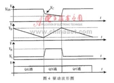 由于加速電容C4的作用,實(shí)際工作時,MOSFET的柵-源極輸入脈沖的下降沿非常陡,且又由于柵-源極輸入電容的作用,使VGS 波形具有一定的斜率,這有利于MOSFET的飽和導(dǎo)通。圖4為驅(qū)動波形。