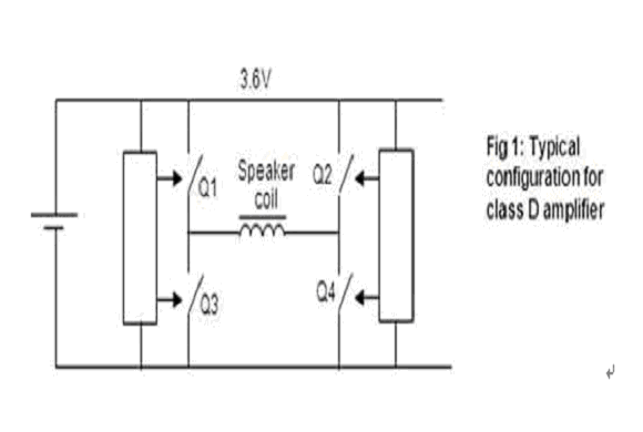 目前的移動電話通常使用D類音頻放大器。這些放大器在一個H橋電路中采用了兩對FET來控制揚聲器線圈。配置如圖1所示。Q1&Q4導通和Q2&Q3關斷時向一個方向驅動揚聲器線圈,Q1&Q4關斷和Q2&Q3導通