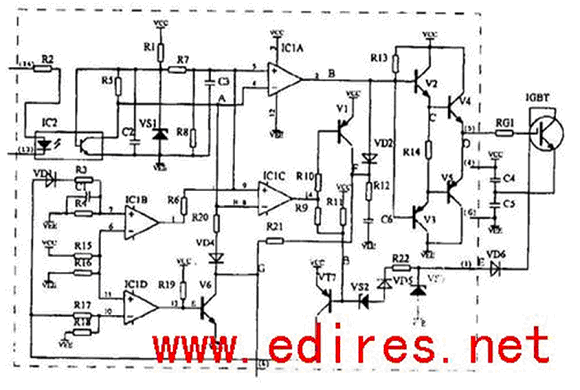 在M57962L輸入端13和14無(wú)電流時(shí),IC1截止,A點(diǎn)電位上升使IC2A的2腳變?yōu)榈碗娢唬瑒t使V3、V5導(dǎo)通,V2、V4截止。lGBT的門(mén)極(GATE)通過(guò)V5導(dǎo)通到VEE,而使IGBT關(guān)斷。IC2C的14腳輸出為低電平, 使V1、V7導(dǎo)通, 使IC2B、IC2D保持原先狀態(tài)不變。
