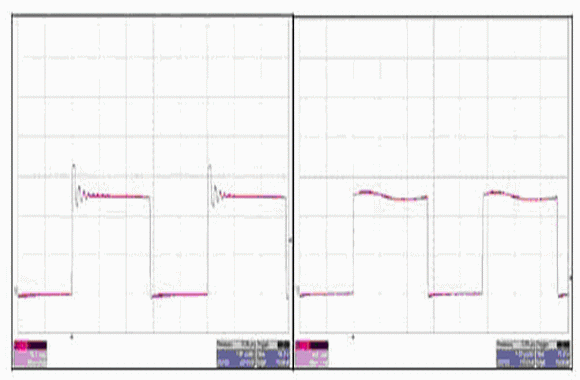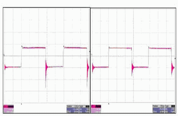 如圖 6 所示,您可以通過變壓器二次級電壓對這兩種設計進行更多的區分。表面看來,這兩個波形極為相似。進一步檢查的話,您就會發現傳統同步反向電源的負振鈴要比有源鉗位反向電源的負振鈴嚴重很多。該振鈴是由同步 FET 關閉延遲引起的,通常出現在主 FET 轉換開啟的時候。請注意,同步 FET 的柵-源關閉電壓與反向次級繞組電壓相同。在變壓器次級電壓變為負值的同時,同步 FET 必須完全關閉(實現這一操作比較困難),否則就會出現直通現象。控制器驅動的柵極驅動信號有源鉗位設計確保了同步 FET 在主 FET開啟之前被關閉,并減少了電壓振鈴。這也影響了對同步 FET 的選擇。與傳統的同步反向電源相比較,有源鉗位設計可以使用一個帶有更低 Rdson 的緩同步 FET。由于 FET 主體二極管的反向恢復,有源鉗位的同步 FET 上仍然會出現少許振鈴現象。