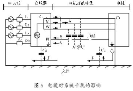 頻率范圍為150 kHz~30 MHz的電子干擾一般來自傳導。傳動系統(tǒng)中范圍為30 MHz~1 GHz 的空間輻射干擾產(chǎn)生于逆變器,電機電纜及電動機。由于電動機電壓較高的dv/dt 以及電機電纜上的容性電流產(chǎn)生了漏電流,而且使用屏蔽的電機電纜也會增加漏電流,如圖6所示。