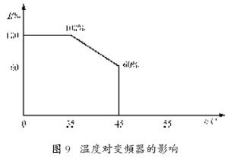 變頻器主要由各種電子元器件組成,它對于工作環(huán)境的要求較高,當環(huán)境溫度超過它的最高工作溫度時,變頻器必然會降低其持續(xù)電流輸出的額定值,如圖9所示。