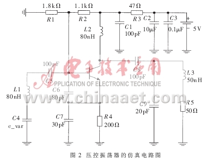 壓控振蕩器(VCO)是鎖相環路的重要組成部分。隨著電子技術的發展,出現了許多集成的VCO芯片。考慮到高頻率穩定度、低相噪的要求,這里采用Agilent公司生產的低噪聲晶體管HBFP0450來設計VCO。常用的VCO一般有三種:晶體壓控振蕩器、LC壓控振蕩器和RC壓控振蕩器。對于超高頻段的VCO,采用LC振蕩器形式;為了提高頻率穩定性,采用了克拉潑電路,并進行了相角補償。
