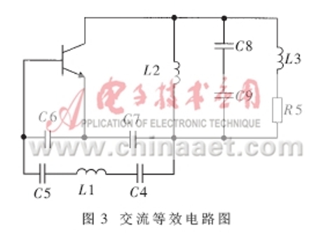 交流等效電路如圖3所示。L1、C4和C5串聯可以等效成一個電感,從而滿足電容三端振蕩器的相位條件。L1、C4、C5、C6、C7構成了諧振回路,振蕩頻率主要由這五個元件所決定。頻率計算公式如下: