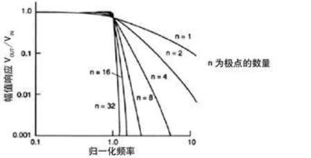 圖1 幾個低通濾波器的幅值響應與歸一化頻率的關系曲線。如果濾波器傳遞函數有多個極點(或階數),則頻率越高,衰減越快。