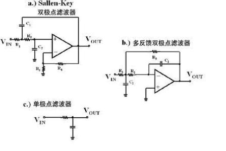 圖4 Sallen-Key (a)和多反饋 (b)濾波器都是2階,都有2個極點。單極點濾波器(c)是1階濾波器。這些模塊可以級聯,以生成高階濾波器。