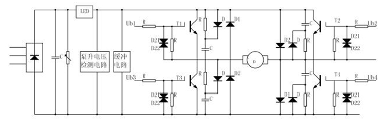電機停車或減速時工作在制動狀態,儲存在電機和負載運動部分的動能將變成電能,并通過PWM 變換器回饋給直流電源。系統有不可控的整流器供電,不能向電網回饋電能,只好對電容器C 充電而使泵升電壓升高,過高的泵升電壓有可能擊穿變換元件。泵升電壓檢測電路如圖3。