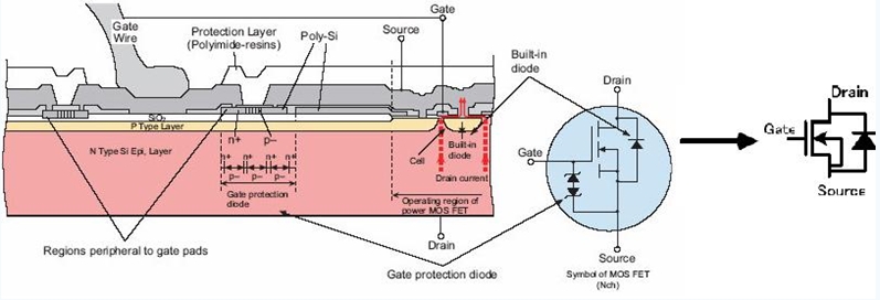 在MOS管原理圖上可以看到,漏極和源極之間有一個寄生二極管。這個叫體二極管,在驅(qū)動感性負載(如馬達),這個二極管很重要。順便說一句,體二極管只在單個的MOS管中存在,在集成電路芯片內(nèi)部通常是沒有的。下圖是MOS管的構(gòu)造圖,通常的原理圖中都畫成右圖所示的樣子。 (柵極保護用二極管有時不畫)