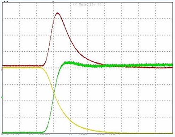 下圖是MOS管導(dǎo)通時的波形。可以看出,導(dǎo)通瞬間電壓和電流的乘積很大,造成的損失也就很大。降低開關(guān)時間,可以減小每次導(dǎo)通時的損失;降低開關(guān)頻率,可以減小單位時間內(nèi)的開關(guān)次數(shù)。這兩種辦法都可以減小開關(guān)損失。