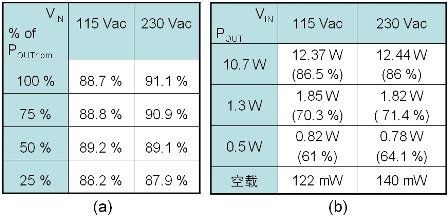 表2:NCP1380谷底開關(guān)控制器的工作能效及待機能耗(a、工作能效;b、輕載及空載能耗)