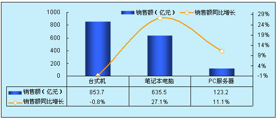 2009年中國IT市場年會(huì)上賽迪顧問發(fā)布的最新研究成果顯示,2008年,包括臺(tái)式PC、筆記本電腦和PC服務(wù)器在內(nèi)的PCs市場銷量達(dá)到3218.5萬臺(tái),同比增長15.2%,銷售額為1612.4億元,同比增長9.6%,增速相比上一年都有較大的下滑。其中,臺(tái)式PC與預(yù)期相比下降最大。