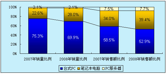 等行業(yè)對(duì)IT集中采購出現(xiàn)延后,部分中小企業(yè)資金也出現(xiàn)問題,采購有所停滯,不過,相比較其他IT硬件產(chǎn)品而言,筆記本電腦受影響程度相對(duì)較小,增速繼續(xù)領(lǐng)跑。據(jù)賽迪顧問統(tǒng)計(jì),2008年,中國筆記本市場銷售量為901.8萬臺(tái),同比增長43.2%,銷售額達(dá)到635.5億元,同比增長為27.1%。