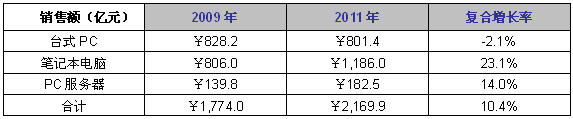 表1 2009-2011年中國PCs市場銷售額預(yù)測(cè)