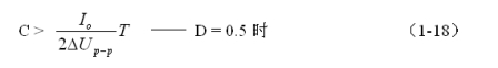 (1-17)和(1-18)式,就是計算串聯式開關電源儲能濾波電容的公式(D = 0.5時)。式中:Io是流過負載的電流,T為控制開關K的工作周期,ΔUP-P為輸出電壓的波紋。電壓波紋ΔUP-P一般都取峰-峰值,所以電壓波紋正好等于電容器充電或放電時的電壓增量,即:ΔUP-P = 2ΔUc 。