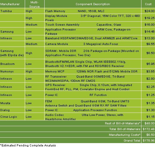 iPhone 3G S的材料及制造成本為178.96美元